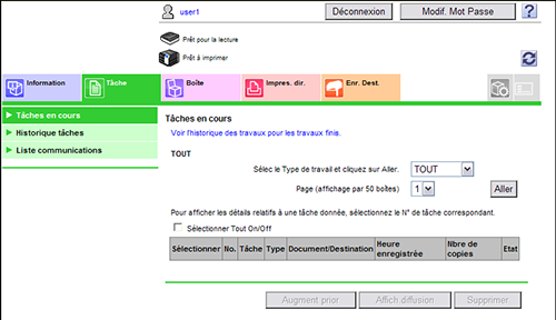 [Tâches actuelles] | Vous permet de vérifier la tâche en cours d'exécution ainsi que la tâche à effectuer. De même, vous permet de décider d'exécuter de préférence une tâche d'impression en attente ou de supprimer une tâche d'émission pour laquelle la fonction Épreuve est spécifiée via le pilote d'imprimante. Si vous êtes connecté en tant qu'utilisateur enregistré, les tâches d'utilisateur connecté peuvent aussi être exécutées. |