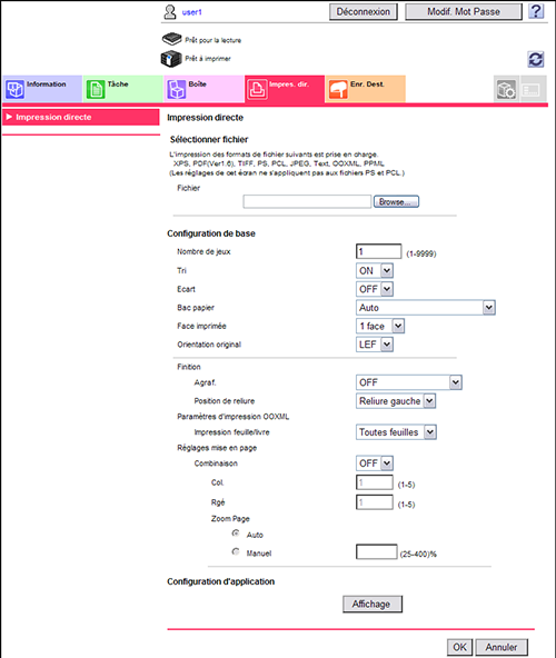 La fonction Impression directe vous permet d'envoyer directement des fichiers PDF (Ver.1.6), JPEG, TIFF, XPS, PS, PCL, Texte, OOXML (.docx/.xlsx/.pptx) et PPML (.ppml/.vdx/.zip) de votre ordinateur ou d'un dossier de partage SMB à cette machine pour les imprimer sans utiliser le pilote d'imprimante.