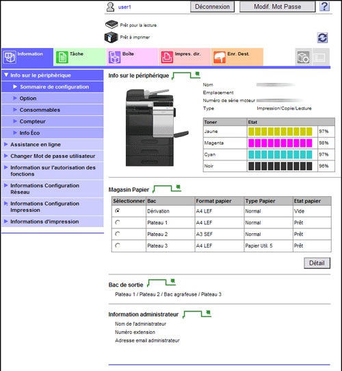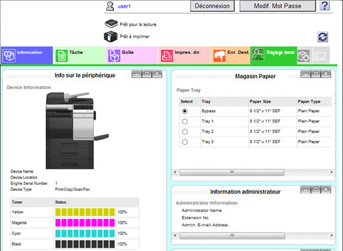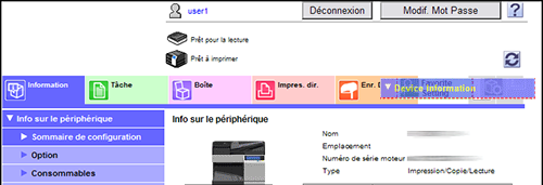 [Informations Périphérique] | Vous permet de vérifier l'état du périphérique, sa configuration, les informations sur les consommables, les compteurs, les informations Éco et l'affichage de la liste des fonctions d'autorisation. |