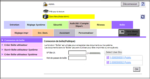 [Créer Boîte utilisateur] | Affiche la liste des boîtes utilisateur enregistrées sur la machine. Vous pouvez créer une nouvelle boîte ou modifier les réglages d'une boîte utilisateur existante. |