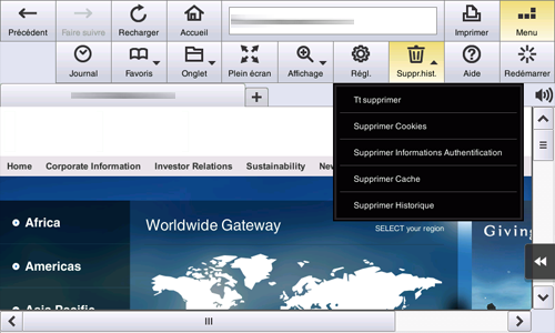 Pour supprimer les données Web (cookies, stockage Web ou base de données indexée), les données cache, les informations d'authentification et d'autres informations, sélectionnez [Menu] - [Suppr. hist.] sur la barre d'outils.