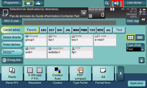 Si vous tapez sur l'icône voix sur l'écran en mode fax/numérisation, la machine explique la procédure de saisie directe d'un numéro de fax. De même, si vous sélectionnez une destination dans le carnet d'adresses ou dans l'historique, la machine répète la procédure de sélection. Ceci s'avère utile pour éviter qu'un fax ne soit envoyé à une destination incorrecte.