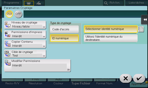 [Type de cryptage] | Sélectionnez [ID numérique] pour crypter un fichier PDF à l'aide d'un certificat numérique. Sélectionnez [Sélectionner identité numérique], puis tapez sur l'icône pour afficher une liste d'adresses e-mail. Sélectionnez dans la liste une adresse e-mail qui contient un certificat numérique de cryptage. [Utilisez l'identité numérique du destinataire] permet d'utiliser un certificat numérique enregistré dans la destination d'envoi du fichier PDF. |