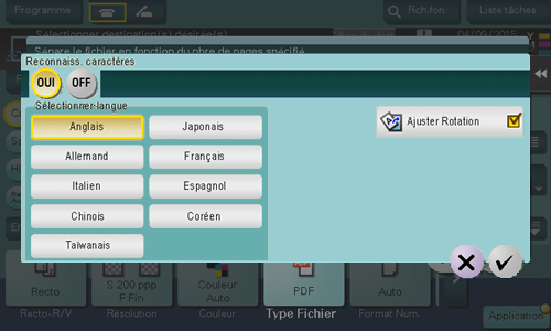 [Sélectionner langue] | Sélectionnez une langue pour le traitement ROC. Sélectionnez la langue utilisée dans l'original pour reconnaître correctement les données de texte. | |