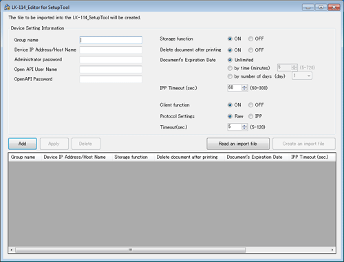 Utilisez LK-114 _Editor for SetupTool pour spécifier des informations telles que l'adresse IP de chaque MFP associé au groupe serverless pull printing et créer un fichier de configuration du groupe serverless pull printing.