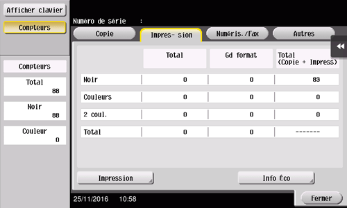 [Couleur] | Permet de vérifier le nombre total de pages imprimées en modes 1 couleur, 2 couleurs, ou Couleurs. |
