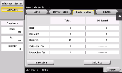 Vérifiez le nombre total de pages d'original numérisées en mode Num./Fax ou mode Boîte ainsi que le nombre total de pages sur lesquelles un fichier d'un Boîte utilisateur ou un fichier reçu a été imprimé. Vérifiez aussi le nombre total de pages envoyées et reçues en mode Fax.