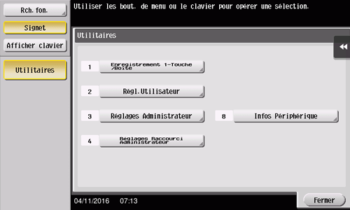 Tapez sur [Utilitaire] sur le menu principal pour vérifier les réglages ou le statut d'utilisation de cette machine.