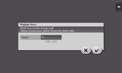 Sur le Clavier numérique entrez le délai avant que cette machine ne passe en mode Eco Energie, puis tapez sur [Valider].