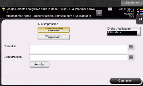 Entrez le nom de l'utilisateur ou de compte département et le mot de passe sur l'écran Connexion puis tapez [Connexion] ou appuyez sur la touche Code pour procéder l'authentification. Une fois qu'une opération cible est terminée, appuyez sur la touche Code pour vous déconnecter.