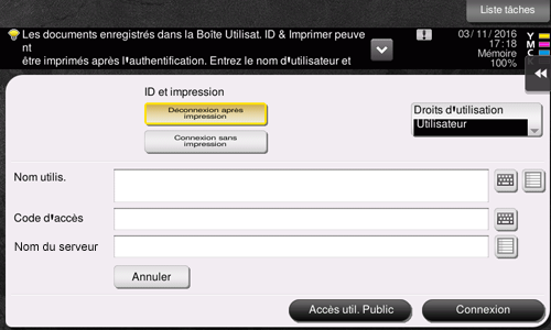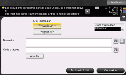 Si Accès util. Public (utilisateurs non enregistrés) est activé, appuyez sur [Accès util. Public] pour vous connecter à cette machine.