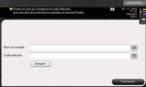 Entrez le nom du compte et le code pour procéder au suivi de compte. Il se peut que le contenu de l'écran Connexion varie en fonction du réglage d'authentification de cette machine.