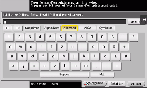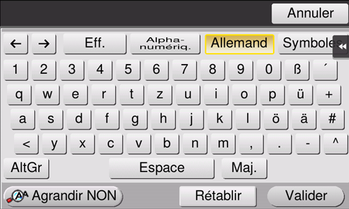 Lorsque vous entrez des caractères pour enregistrer une adresse ou un programme, utilisez le clavier affiché sur l'écran tactile.