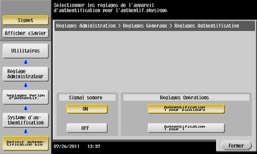 Tapez sur [Réglages Périph d'authentif.] - [Système d'authentification] - [Définir authentification bio] et configurez le réglage suivant.