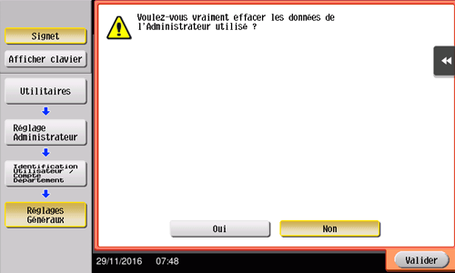 Tapez sur [Utilitaires] - [Réglages administrateur] - [Identification Utilisateur/Compte Département] - [Réglages généraux] - [Authentification].