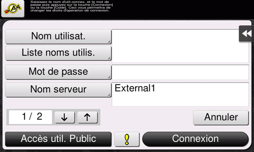 Entrez le nom d'utilisateur et le mot de passe et sélectionnez un serveur pour l'authentification. Il se peut que le contenu de l'écran Connexion varie en fonction du réglage d'authentification de cette machine.