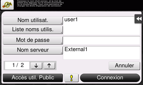 Si l'utilisateur enregistré dispose des privilèges d'administrateur ou des privilèges d'administrateur de boîtes, il peut sélectionner les privilèges d'utilisation à la connexion. Il se peut que le contenu de l'écran Connexion varie en fonction du réglage d'authentification de cette machine.