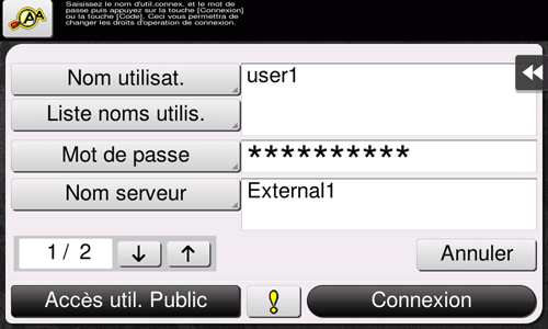Effleurer [Liste noms utilis.] pour afficher une liste des noms d'utilisateur et pour vous permettre de sélectionner un utilisateur à connecter.Tapez sur [Code d'accès] ou sur sa zone de saisie pour entrer le code d'accès, puis tapez sur [OK].