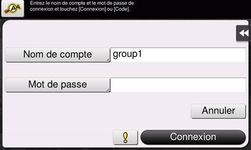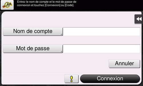 Entrez le nom du compte et le code pour procéder au suivi de compte. Il se peut que le contenu de l'écran Connexion varie en fonction du réglage d'authentification de cette machine.