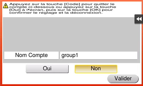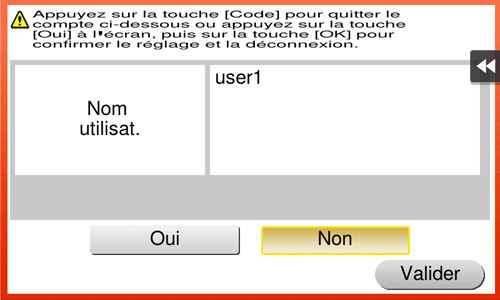 Si vous n'utilisez pas cette machine pendant un certain laps de temps pendant la connexion (par défaut : [1] min.) vous serez automatiquement déconnecté.Sélectionnez [Oui], puis tapez [Valider].