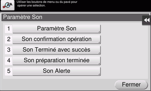 Sélectionnez s'il faut respectivement sonoriser chaque [son de confirmation], [son opération terminée], [son préparation terminée] et [son alerte].