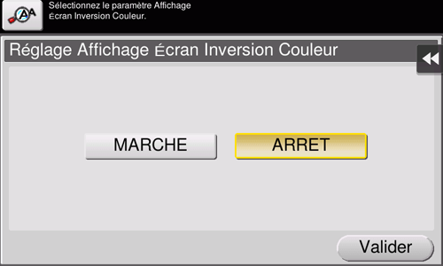 Tapez sur [Accessibilité] - [Réglage Affichage Écran Inversion Couleur], puis sélectionnez s'il faut inverser la couleur d'affichage de l'écran (par défaut : [ARRET]).