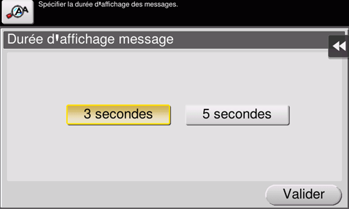 Tapez sur [Accessibilité] - [Durée affichage / messages] et sélectionnez [3 secondes] ou [5 secondes] (par défaut : [3 secondes]).