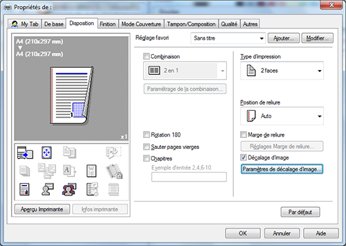 Pour permettre le décalage d'image, cochez la case [Décalage d'image] sur l'onglet [Disposition] et cliquez sur [Paramètres de décalage d'image].