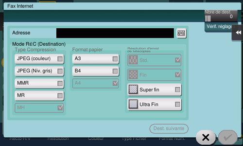 Si vous avez enregistré des destinations abrégées pour la fonction Fax Internet, vous pouvez les sélectionner dans le [Carnet adres].Entrez l'adresse e-mail de la destination dans [Adresse] et sélectionnez un format de compression, le type de papier et la résolution pris en charge par la machine de destination sous [Mode RÉC (Destination)].