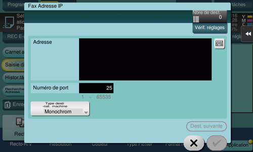 Si vous avez enregistré des destinations abrégées pour la fonction Fax Adresse IP, vous pouvez les sélectionner dans le [Carnet adres].Entrez soit l'adresse IP, le nom d'hôte ou l'adresse e-mail de la destination dans [Adresse], le numéro de port utilisé pour l'émission du fax dans [Numéro de port], puis sélectionnez [Couleur] ou [Noir & Blanc] sous [Type destinat. machine].