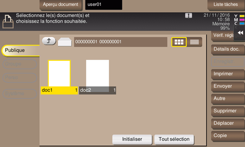Vous pouvez aussi ouvrir la boîte utilisateur désirée en la tapant sur deux fois.Pour imprimer un fichier, sélectionnez un fichier à imprimer et tapez sur [Imprimer].