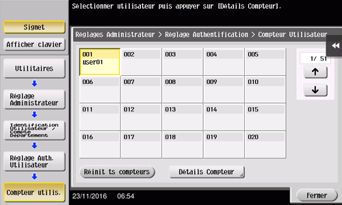Sélectionnez [Identification Utilisateur/Compte Département] - [Réglage Auth. Utilisateur] - [Compteur utilis.]
