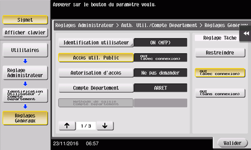 Sélectionnez [Accès util. Public], puis [OUI (avec connexion)] ou [OUI (Sans connexion)], et tapez sur [Valider].