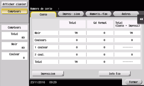 Vous pouvez vérifier le nombre de documents produits pour d'autres fonctions en sélectionnant [Impression], [Numéris./Fax] ou [Autres].