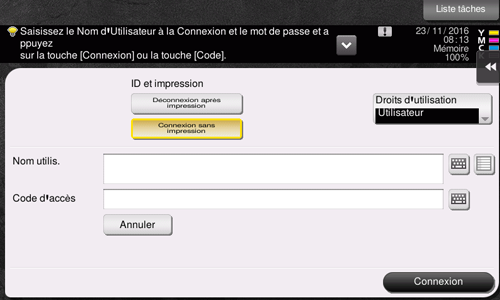 Entrez le [Nom utilis.] et le [Code d'accès] enregistrés dans cette machine et tapez sur [Connexion]. En cas d'authentification réussie, vous êtes autorisé à utiliser cette machine.