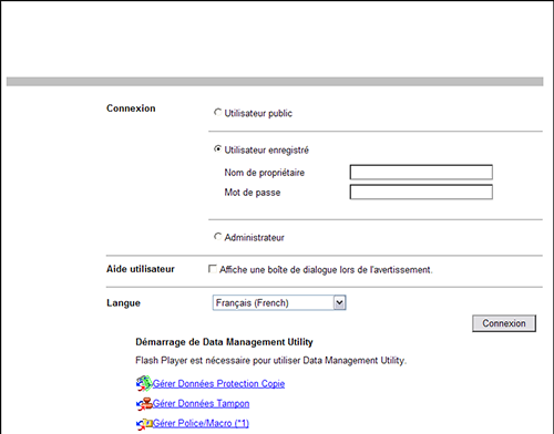 Entrez le [Nom de propriétaire] et le [Mot de passe] enregistrés dans cette machine et cliquez sur [Connexion]. En cas d'authentification réussie, vous êtes autorisé à utiliser Web Connection.