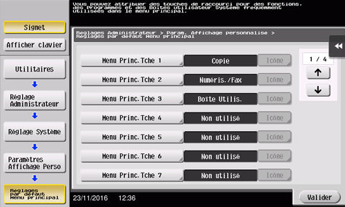 Sélectionnez [Réglage Système] - [Paramètres Affichage Perso] - [Réglages affichage Menu principal].
