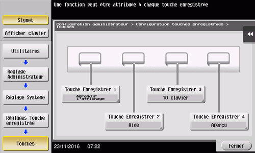 Sélectionnez [Réglage Système] - [Réglages Touche enregistrée] - [Touches].