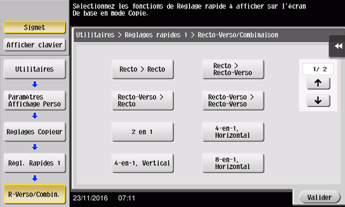 Sélectionnez [Paramètres affichage perso] - [Réglages copieur] et ensuite [Réglages rapides 1] ou [Réglages rapides 2].