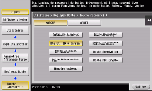 Sélectionnez [MARCHE] ainsi que le réglage à afficher comme touche de raccourci, puis tapez sur [Valider].