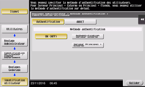 L'état d'authentification peut être [ON (MFP)], [Authentification serveur externe], [Serveur Principal + Externe], [Auhentification serveur renforcée] ou [Serveur principal + Étendu]. Pour plus d'informations sur l'authentification orientée serveur, veuillez contacter l'administrateur du serveur.