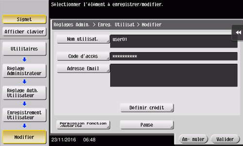 Sélectionnez le numéro d'enregistrement d'un utilisateur cible, puis tapez sur [Modifier].