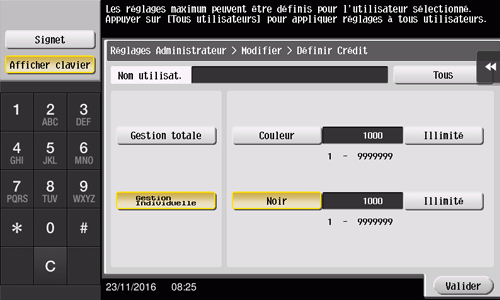 Tapez sur [Définir Crédit] et [Couleur] ou [Noir], puis entrez à l'aide du clavier le nombre maximum d'originaux couleur/noir que l'utilisateur peut imprimer.