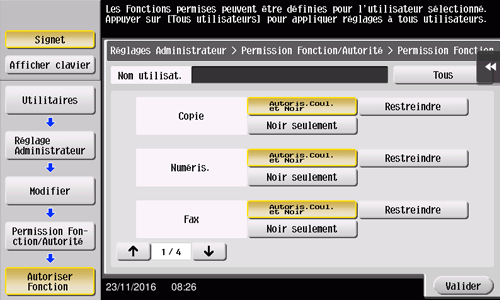 Tapez sur [Privilèges/autorisation de fonctions] - [Autorisation de fonctions] pour délimiter les autorisations respectives aux différentes fonctions.