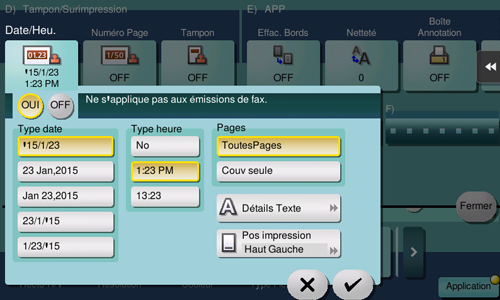 Tapez sur [OUI], réglez les valeurs pour [Type date], [Type heure] et [Pages], puis tapez sur [OK].