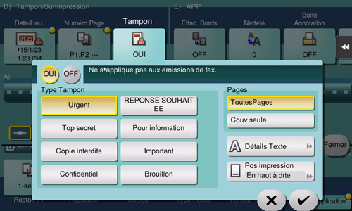 Tapez sur [OUI], réglez les valeurs pour [Type Tampon] et [Pages], puis tapez sur [OK].