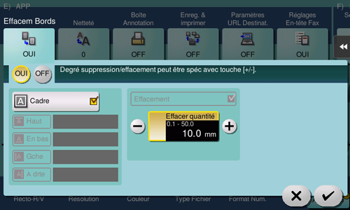 Pour effacer la même largeur sur les quatre côtés de l'original, tapez sur [+] et [-] pour spécifier la largeur à effacer.