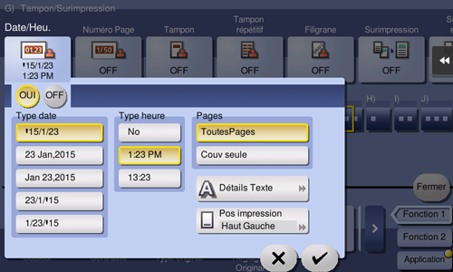 Tapez sur [OUI], réglez les valeurs pour [Type date], [Type heure] et [Pages], puis tapez sur [OK].