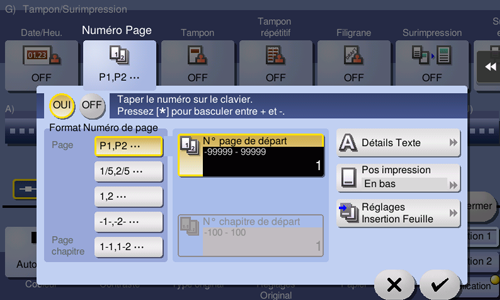Tapez sur [OUI], réglez les valeurs pour [Format Numéro de page] et [N° page de départ], puis tapez sur [OK].
