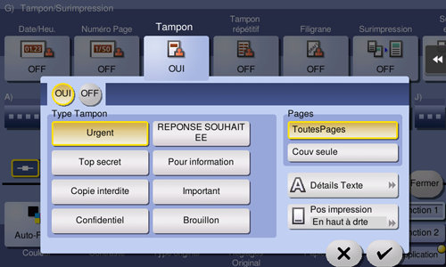 Tapez sur [OUI], réglez les valeurs pour [Type Tampon] et [Pages], puis tapez sur [OK].